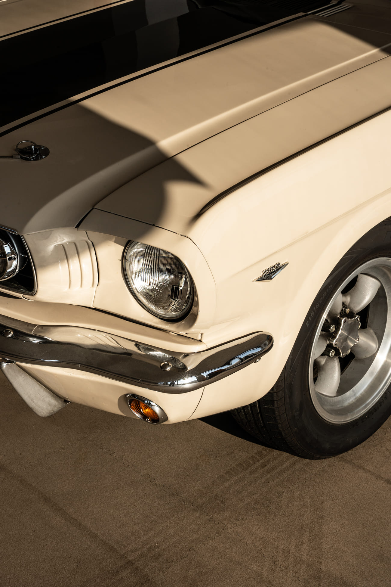 Crema – der 1965er Ford Mustang in edlem Creme mit markanten schwarzen Streifen. Mit seinem 298 V8-Motor und 200 PS bietet dieses Coupé pure Power und klassischen Mustang-Charme. Das außergewöhnliche Design und der unverwechselbare Sound machen jede Fahrt zu einem aufregenden Erlebnis. Perfekt für alle, die Stil, Geschwindigkeit und die Legende eines echten Mustangs erleben möchten!